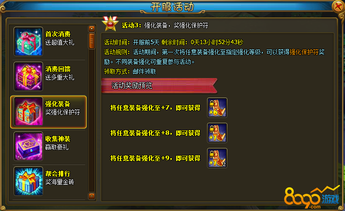 活动规则:活动期间,第一次将任意装备强化至指定强化等级,可以获得强化保护符奖励。不同装备强化可重复参与活动。