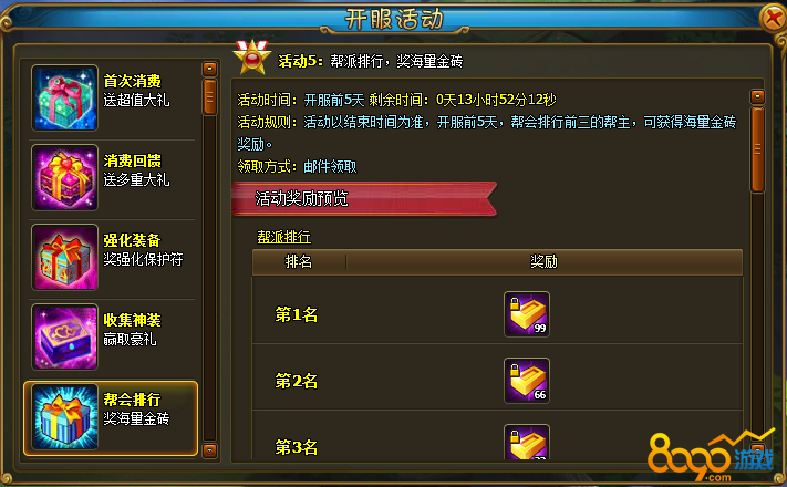 活动规则:活动以结束时间为准,开服前5天,帮会排行前三的帮主,可获得海量金砖奖励。