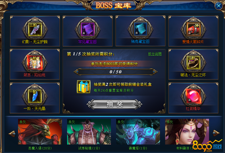 玩家通过每天击杀boss获得积分抽奖,脸白的玩家这是逆袭土豪好机会呢。