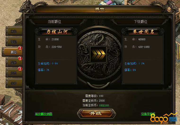 爵位系统升级消耗圣妖币,圣妖币可以通过金币兑换获得。