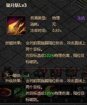隔月斩作为游戏前期技能,也是较为主要的输出技能,技能效果对前面敌方施展隔位斩击,攻击直线上的两个目标,对目标造成基于技能等级的伤害,技能等高越高伤害越高。
