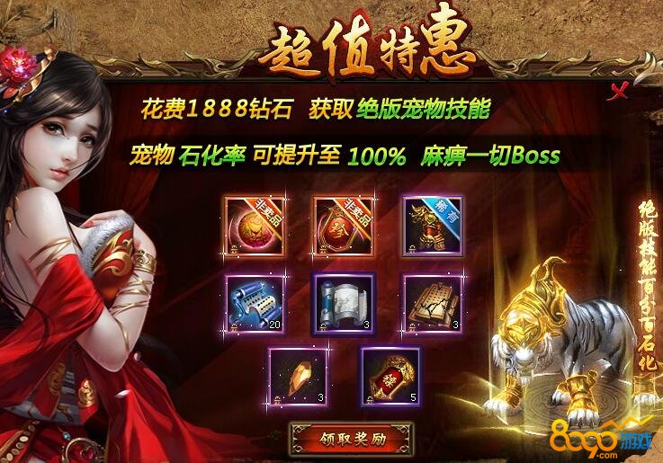 在灭神中,每个新服都会有超值 特惠,第一档的超值特惠只需要1888钻石就可以获得宠物麻痹丹,珍宝阁20阶极品战甲以及海量道具材料,宠物麻痹丹不用多说,是一定要买的,珍宝阁一共7天,能够开出非常多的道具,对于战力提升有很大帮助