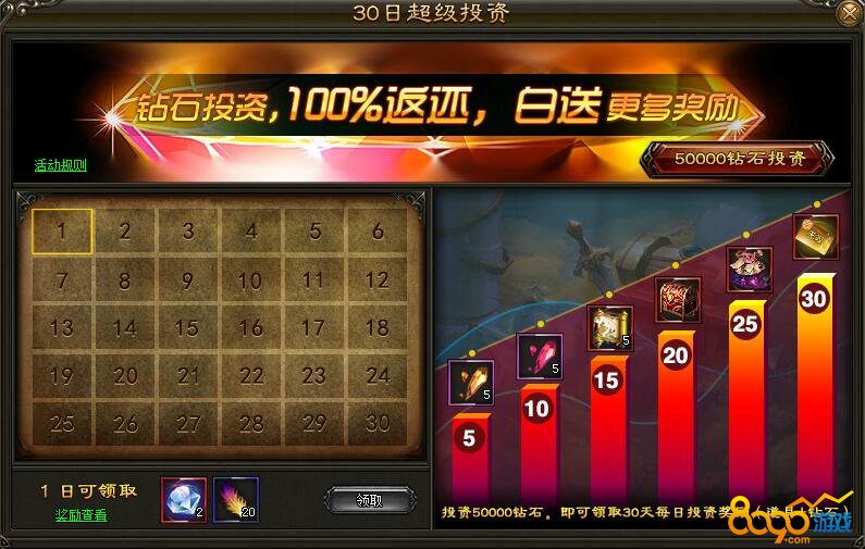 在灭神中,新区开区7天之后都可以购买30日超级投资,只需要5W钻石就可以购买,购买之后每天反还一部分钻石,一个月内总共反还5W钻石,还会额外赠送永久称号,8级宝石,36阶红装等道具,可以说是只赚不赔,长期玩并且想提升战力的玩家一定要买这个超级投资