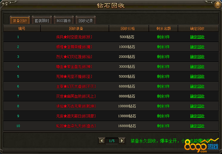 灭神独特的装备回收系统让不少玩家可以在游戏的同时获得非凡的奖励,35阶以上红装都能回收成钻石,而套装,紫装,金装等都能回收到不菲的元宝,对于玩家来说是非常良心的系统。