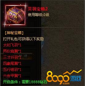 而灵羽宝箱2只需要18888钻石就可以开启,开启后会得到“太初飞羽,两仪肩翼,三才纤羽,四象尾翼,五行翎羽,六合甲翼”这六件灵羽装备,后期三件同样的装备还能够合成为更高级的灵羽装备,对于想要增加战力的玩家朋友们来说这个宝箱是一定要开的。
