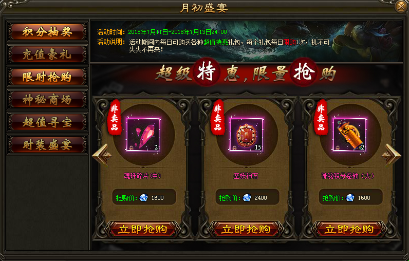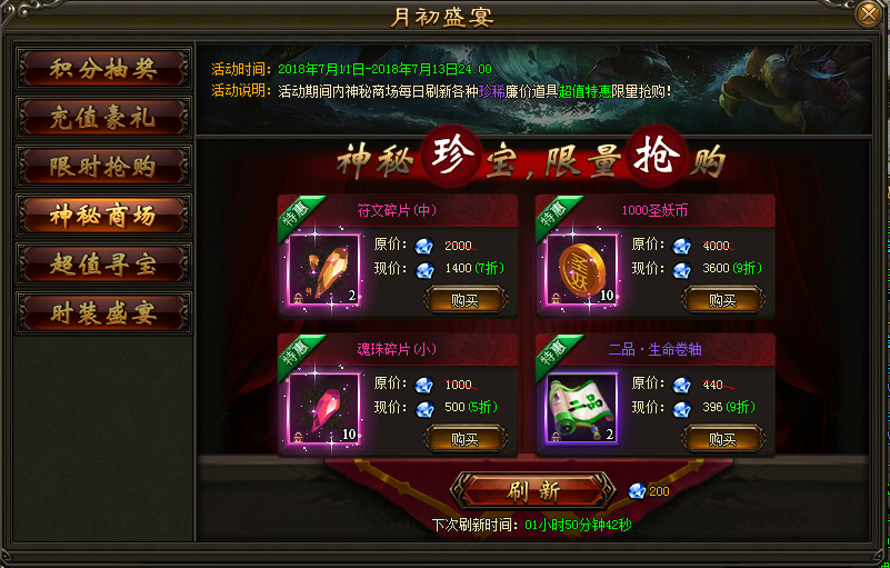 2. 活动期间内,神秘商场每日刷新各种珍稀道具,打折出售限量抢购。