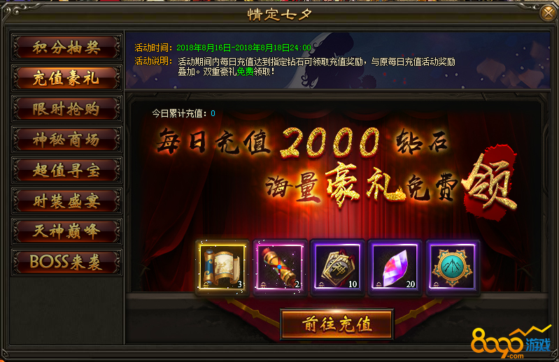 2. 活动期间内,每日充值达指定钻石数额,即可领取充值奖励,可原每日充值奖励叠加领取。