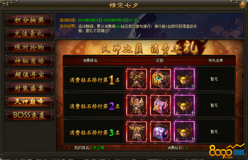 2. 活动期间内,累计消费满300000钻石即可参与排行,排行前3名的玩家可免费领取高级盔甲、灭神首饰箱、海量元宝等海量豪礼