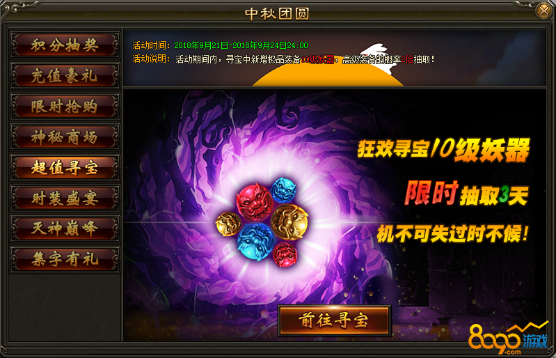 1. 活动期间,王之宝藏可抽取10级妖器,高级装备概率翻倍!活动限时3天,机不可失过时不候