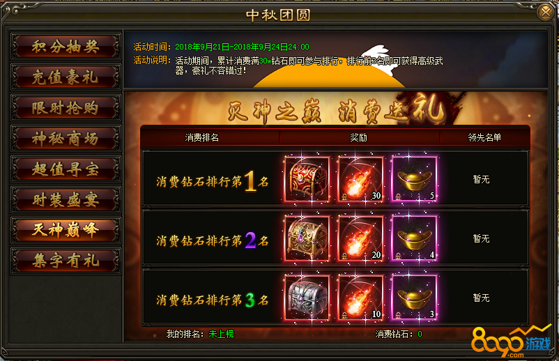 2. 活动期间内,累计消费满300000钻石即可参与排行,排行前3名的玩家可免费领取高级武器/灭神首饰箱、焚天异火、海量元宝等海量豪礼