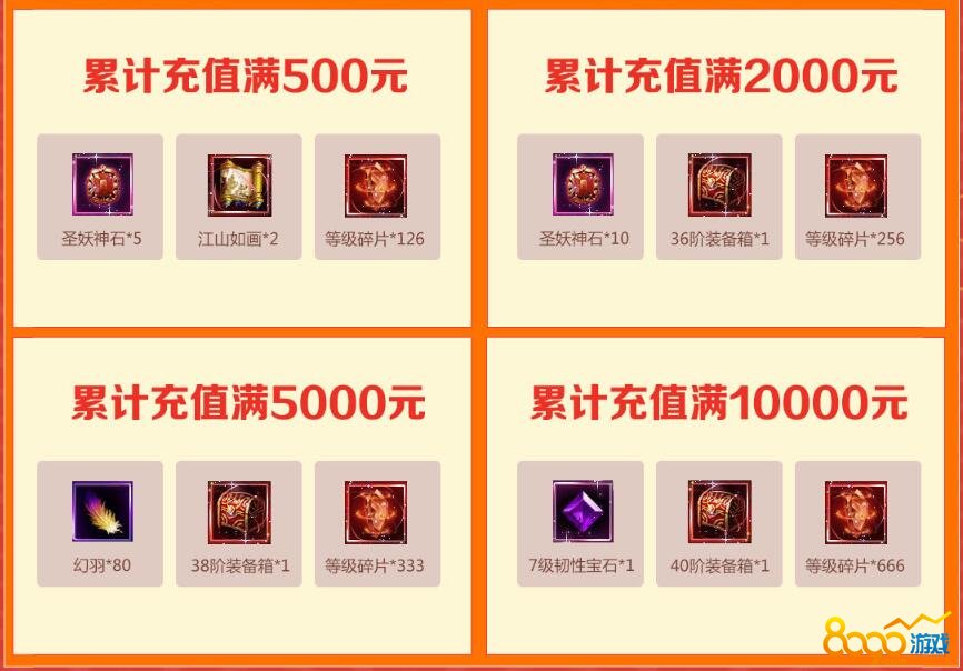 累计充值满2000元,可获得:圣妖神石*10、36阶装备箱*1、等级碎片*256