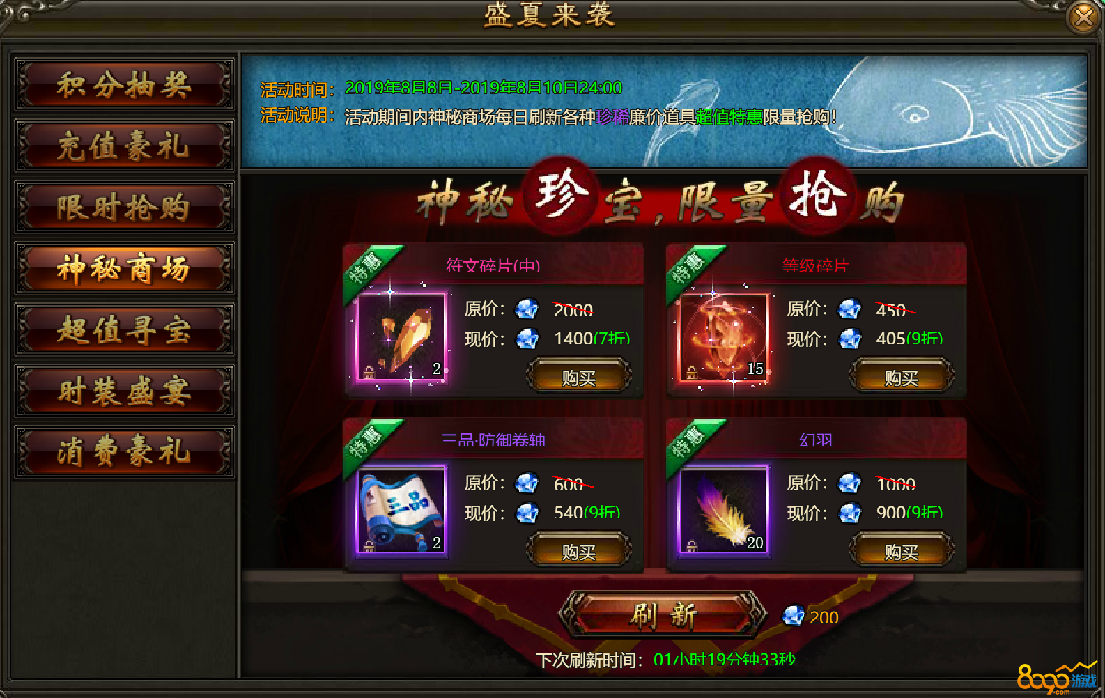 2. 活动期间内,神秘商场每日刷新各种珍稀道具,打折出售限量抢购。