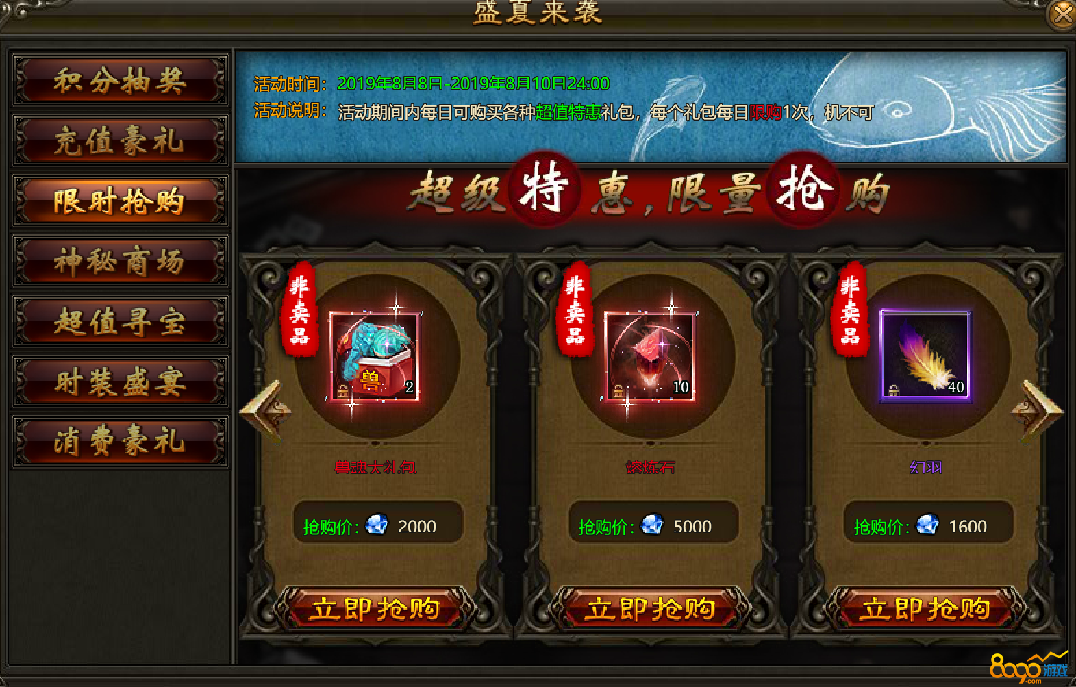 2. 活动期间内,每日可购买各种非卖品特惠礼包,每个礼包每日限购1次。
