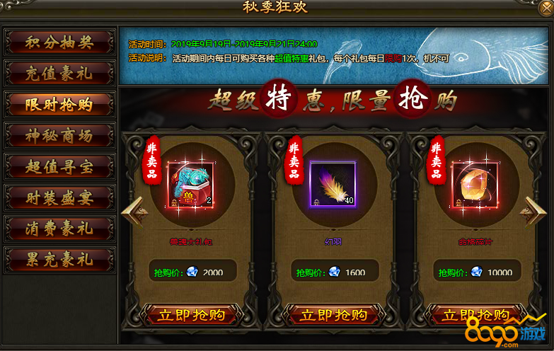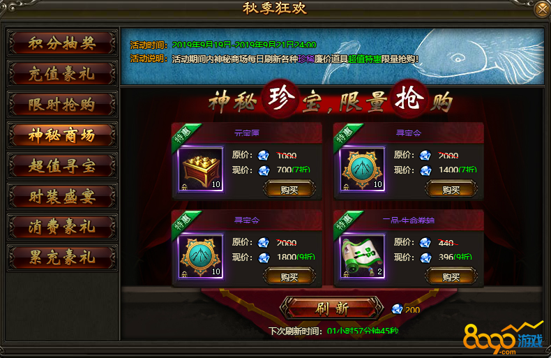 2. 活动期间内,神秘商场每日刷新各种珍稀道具,打折出售限量抢购。