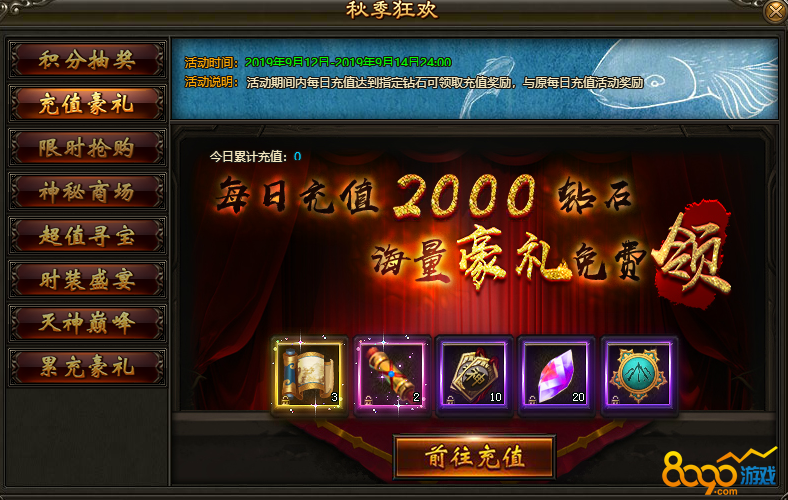 2. 活动期间内,每日充值达指定钻石数额,即可领取充值奖励,可原每日充值奖励叠加领取。