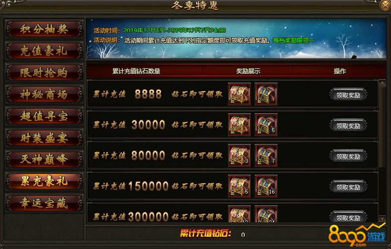 2.活动期间内,每日充值达指定钻石数额,即可领取充值奖励,可原每日充值奖励叠加领取。