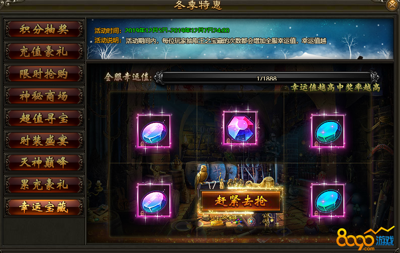 1.活动期间,王之宝藏可抽取妖器装备!高级装备概率翻倍!活动限时3天,机不可失过时不候
