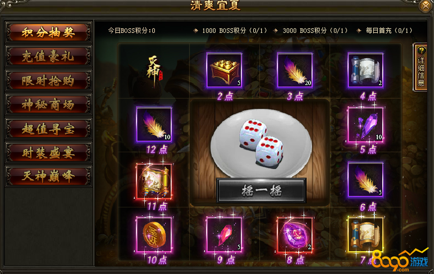 2.活动期间内,玩家击杀boss可获得boss积分,boss积分数量达指定档次可免费投掷一次骰子,根据骰子点数可领取奖励。每日最多可获得三次