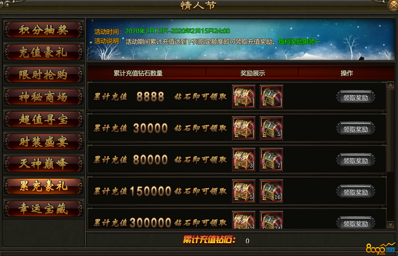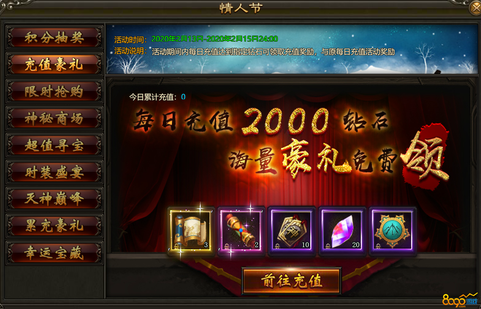 2.活动期间内,每日充值达指定钻石数额,即可领取充值奖励,可原每日充值奖励叠加领取。