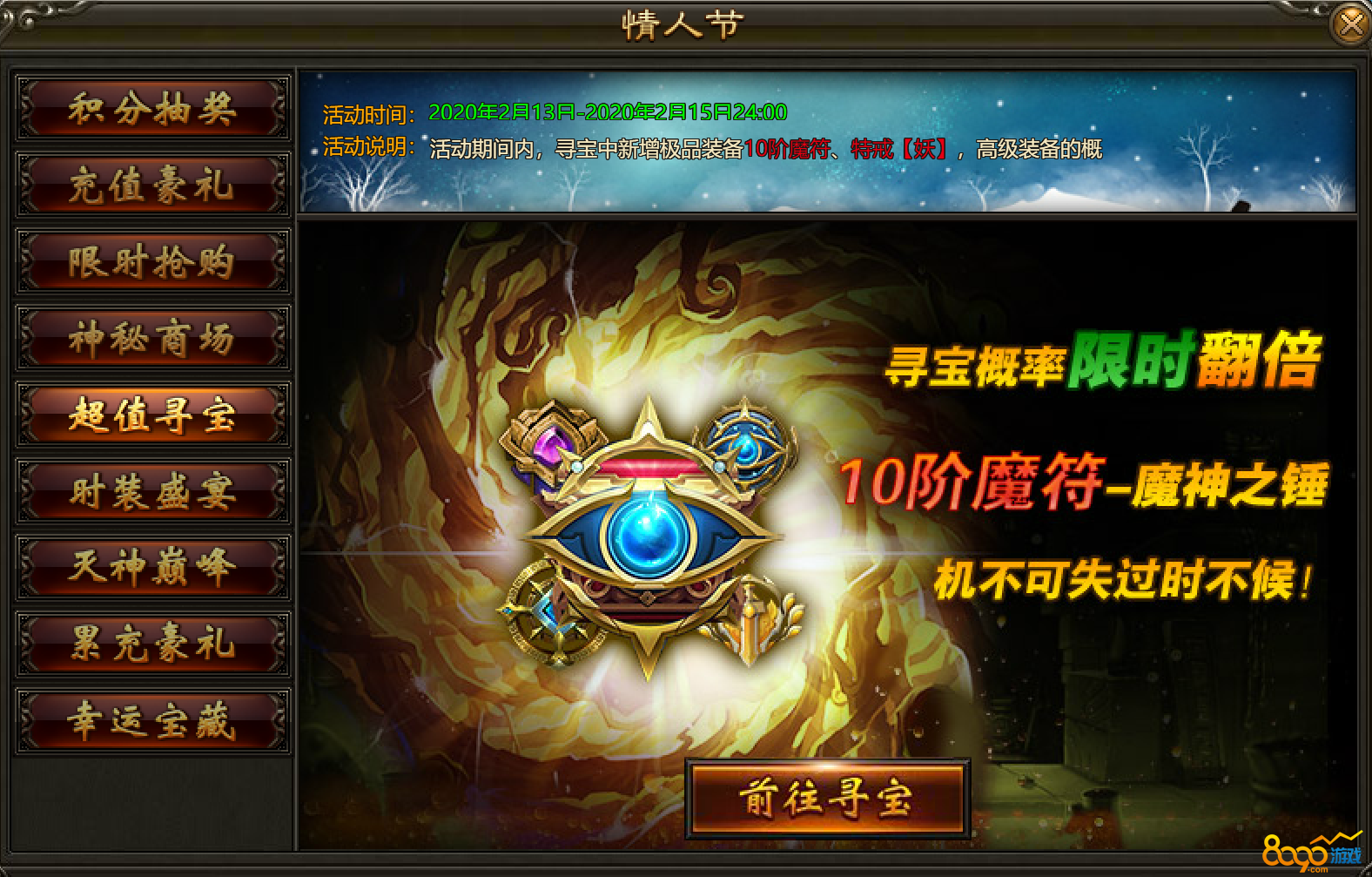1.活动期间,王之宝藏可抽取妖器装备!高级装备概率翻倍!活动限时3天,机不可失过时不候