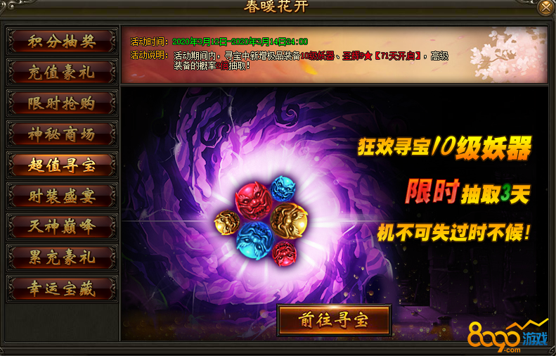 1.活动期间,王之宝藏可抽取妖器装备!高级装备概率翻倍!活动限时3天,机不可失过时不候