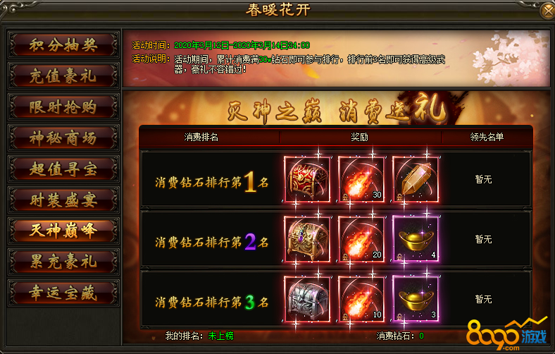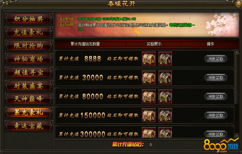3.有两档奖励可领取:2000钻石、20000钻石。每档都有丰厚豪礼免费领取。