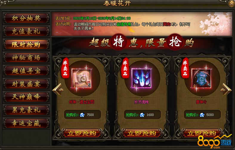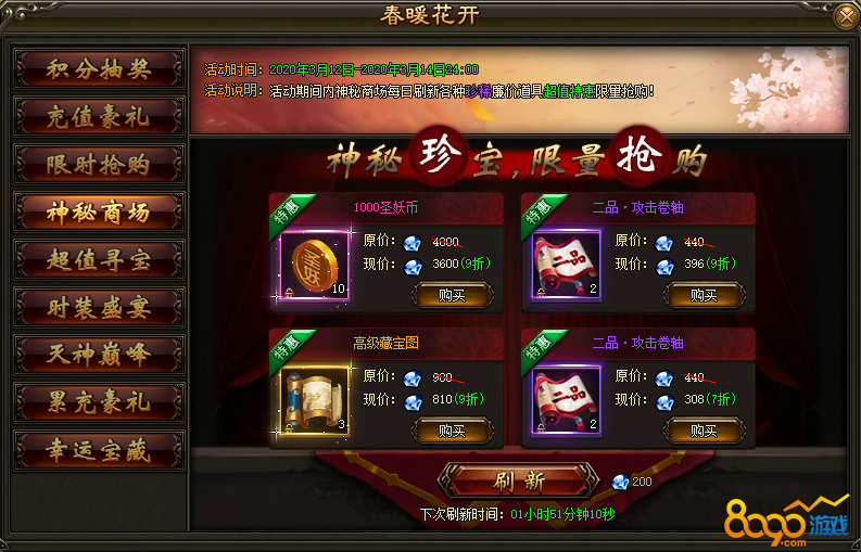 2.活动期间内,神秘商场每日刷新各种珍稀道具,打折出售限量抢购。