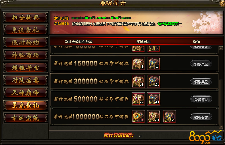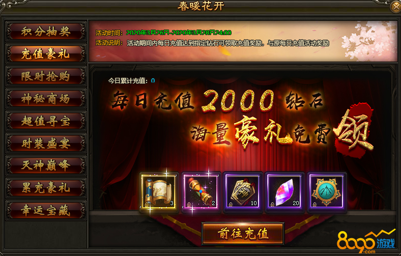 2.活动期间内,每日充值达指定钻石数额,即可领取充值奖励,可原每日充值奖励叠加领取。