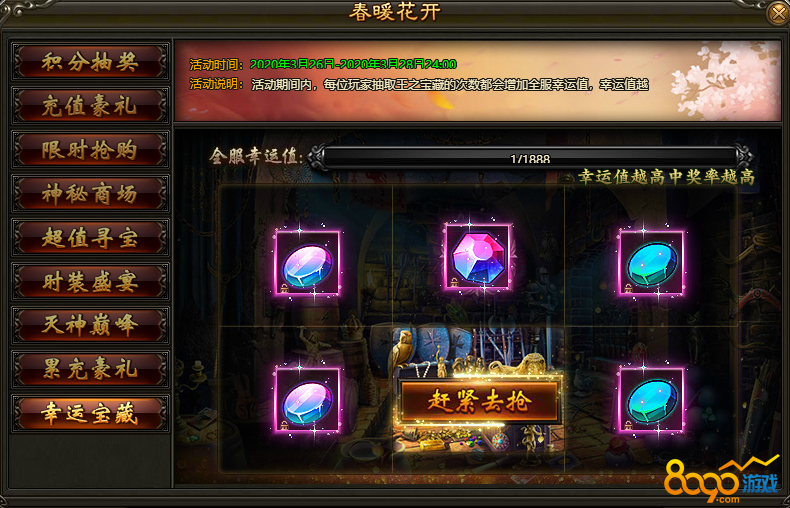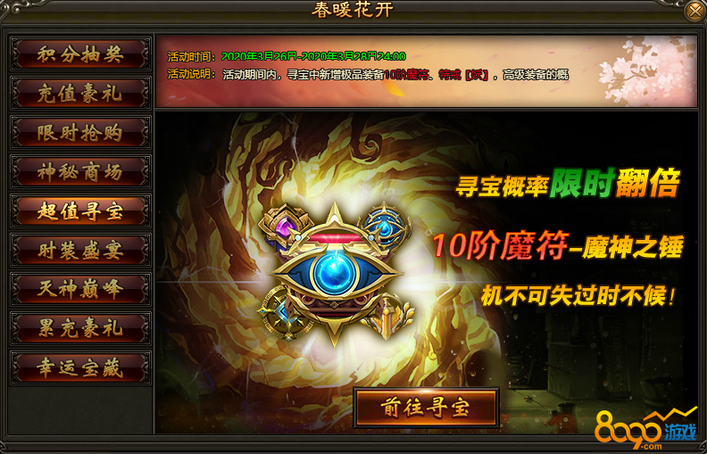 1.活动期间,王之宝藏可抽取妖器装备!高级装备概率翻倍!活动限时3天,机不可失过时不候