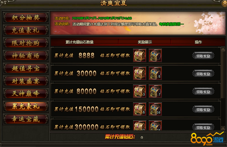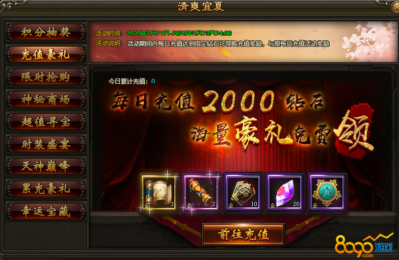 2.活动期间内,每日充值达指定钻石数额,即可领取充值奖励,可原每日充值奖励叠加领取。