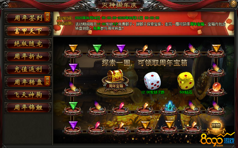 2.活动期间内,每日12点自动发放五次骰子,骰到几就前进几格,走到哪格即可自动领取该格内的奖励,走完一圈可领取周年宝箱。