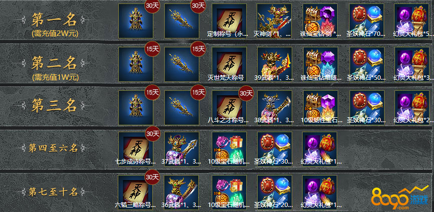 2充值总额满3000元以上的玩家可参与竞争前十名的高级装备奖励(同一账号不同角色的充值分开计算)