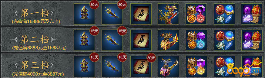 6三天累计充值满8888元至16887元之间的玩家即可申请第二档奖励,(所有满足金额的都可以获取奖励,名额无限)