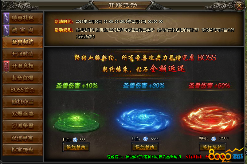 活动介绍:活动期间抵押钻石签订契约可使圣兽伤害暴增,活动结束后全额返还!