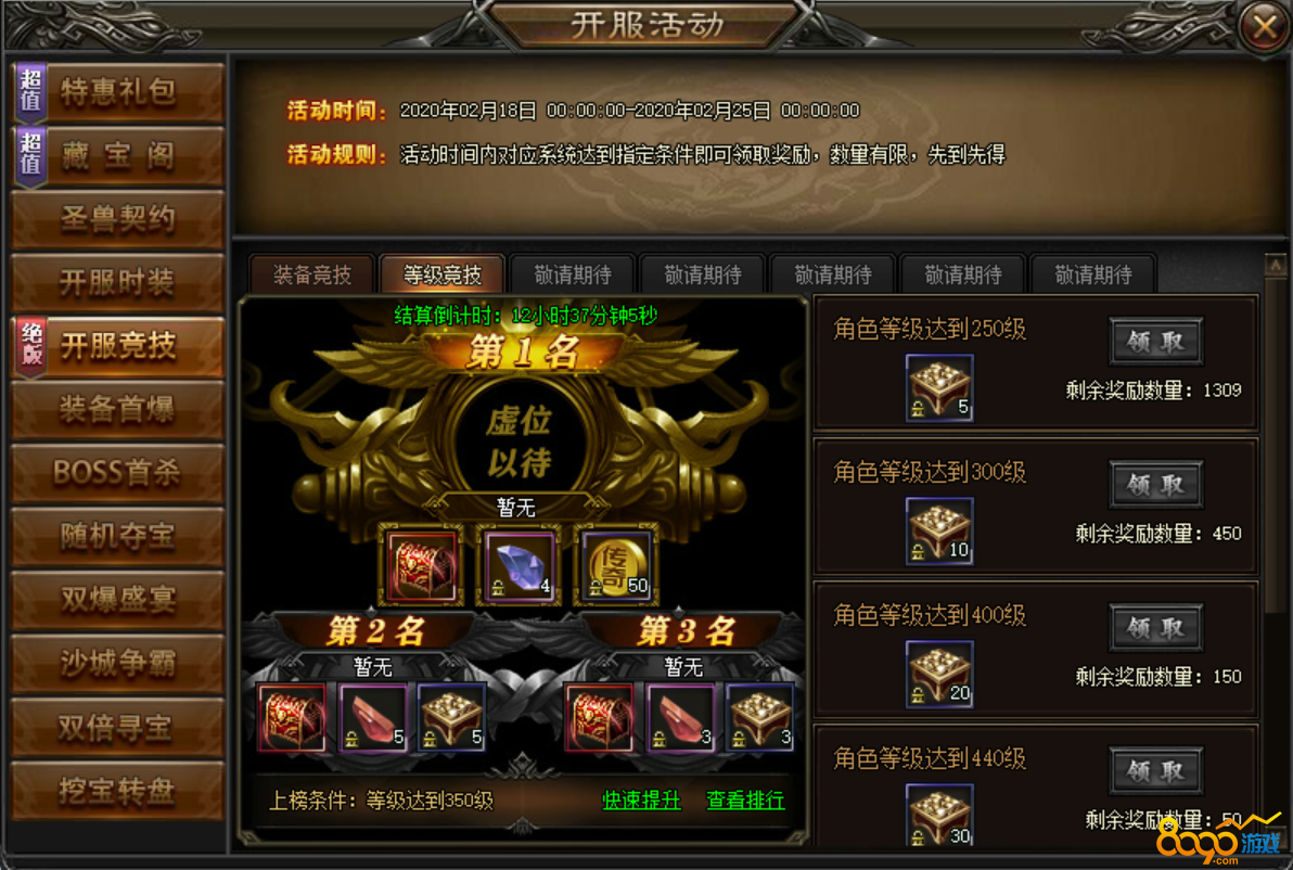 活动介绍:开服后每天都会开放竞技排行,满足条件时即可领取大量奖励,排行前三的在榜单结束时还可额外领取超级奖励