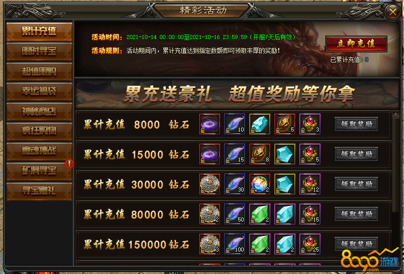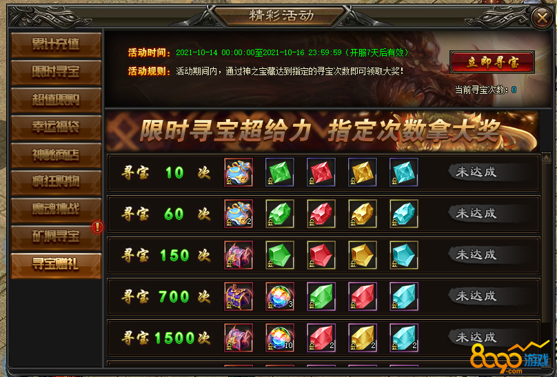 规则:活动开启后,通过神之宝藏达到指定的寻宝次数即可领取大奖。