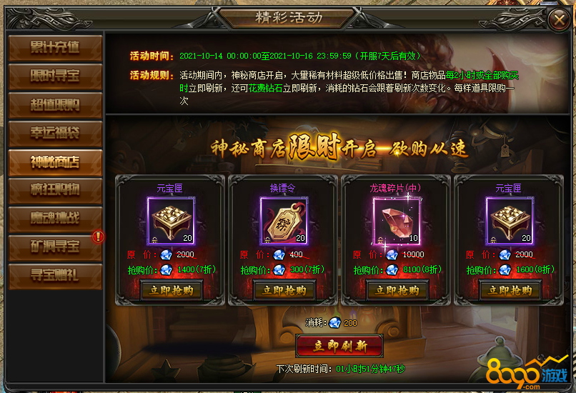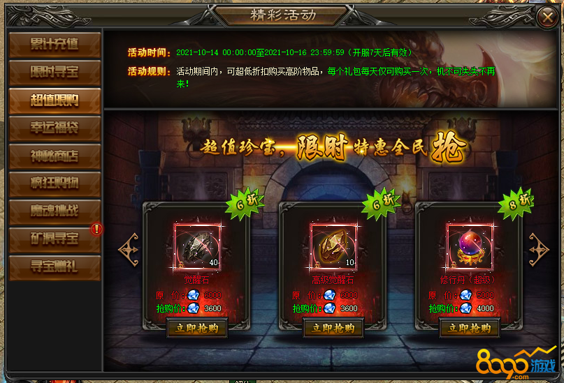 规则:活动期间,可超低折扣购买高阶商品,每个礼包每天仅可购买一次。