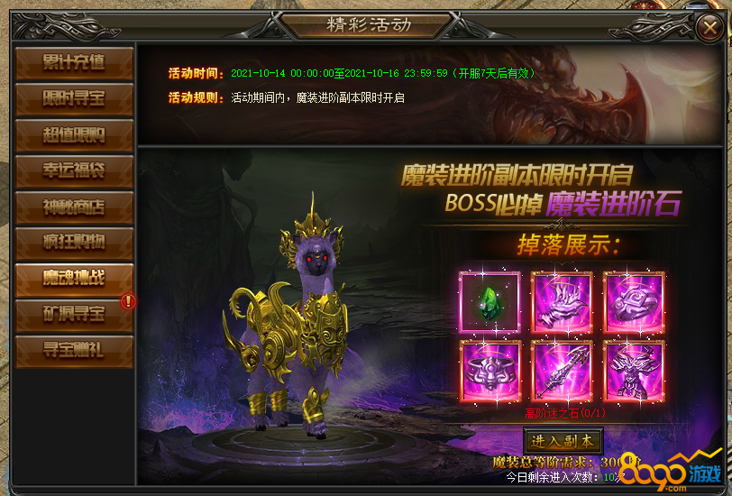 规则:活动期间内,神之宝藏开启星石装备跟兽神装备奖池。
