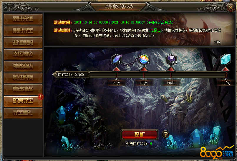 规则:活动期间内,消耗钻石可挖掘初级强化石,挖掘时有概率触发5倍暴击。
