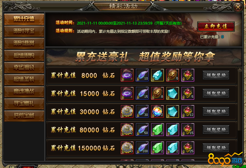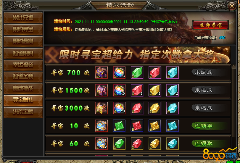 规则:活动开启后,通过神之宝藏达到指定的寻宝次数即可领取大奖。