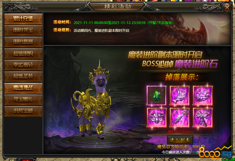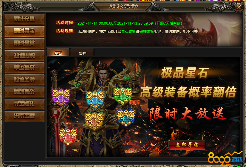 规则:活动期间内,神之宝藏开启星石跟兽神装备奖池。