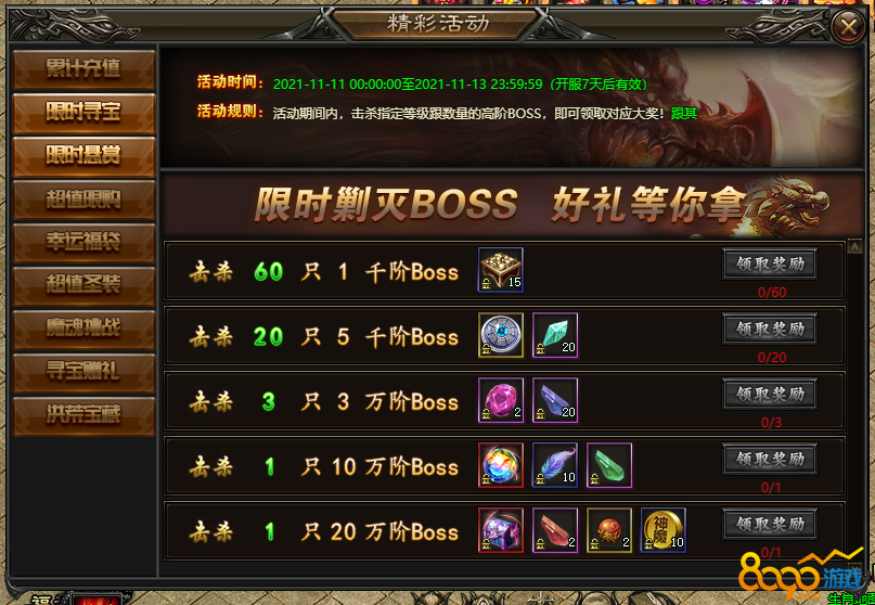 规则:活动期间内,击杀指定等级跟数量的高阶boss,即可领取对应大奖。