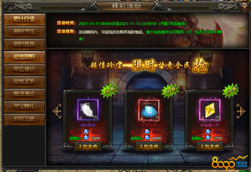 规则:活动期间,可超低折扣购买高阶商品,每个礼包每天仅可购买一次。