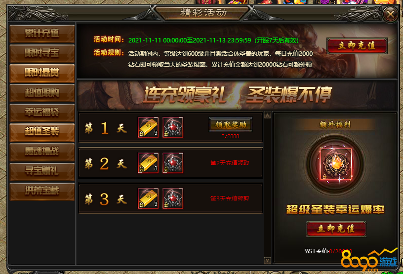 规则:活动期间内,等级刀刀600级并且激活合体圣兽的玩家,每日充值2000钻即可领取当天的圣装爆率,累计充值金额达到20000钻石可额外领取1次超级圣装爆率。