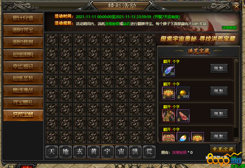 规则:活动期间内,消耗洪荒秘钥或钻石进行翻牌寻宝,每个牌子下面都有不同的奖励,每列只有一个对应文字,翻出文字后自动获得该列还未翻开的奖励。