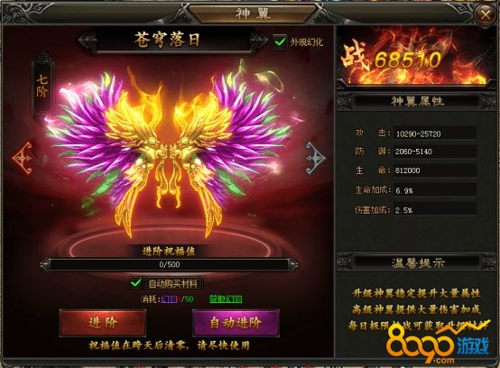 升级神翼稳定提升大量属性,高级神翼提供大量的伤害加成,每日极限挑战能获得升级材料。