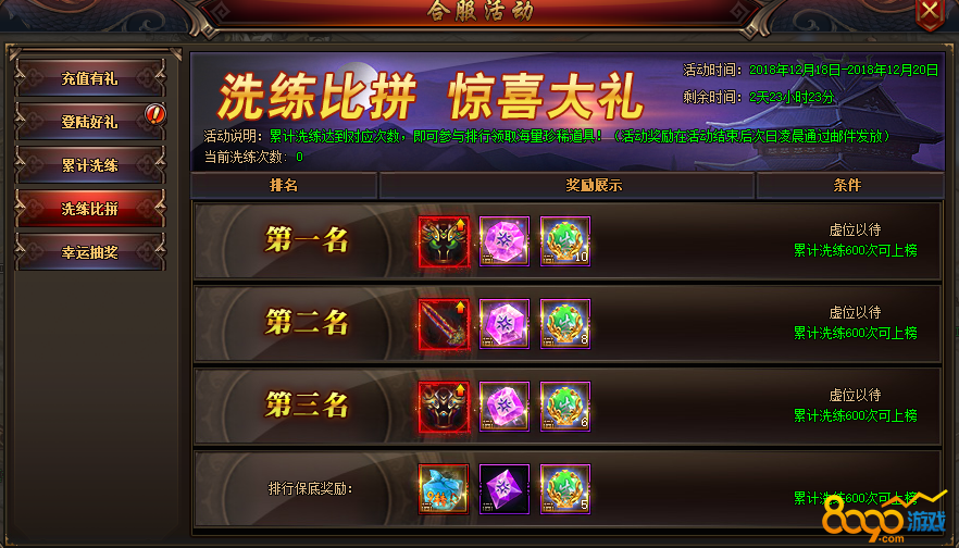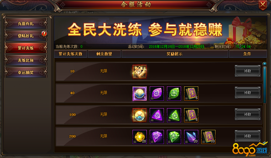 3. 累计洗练:达到洗练次数,领取对应奖励