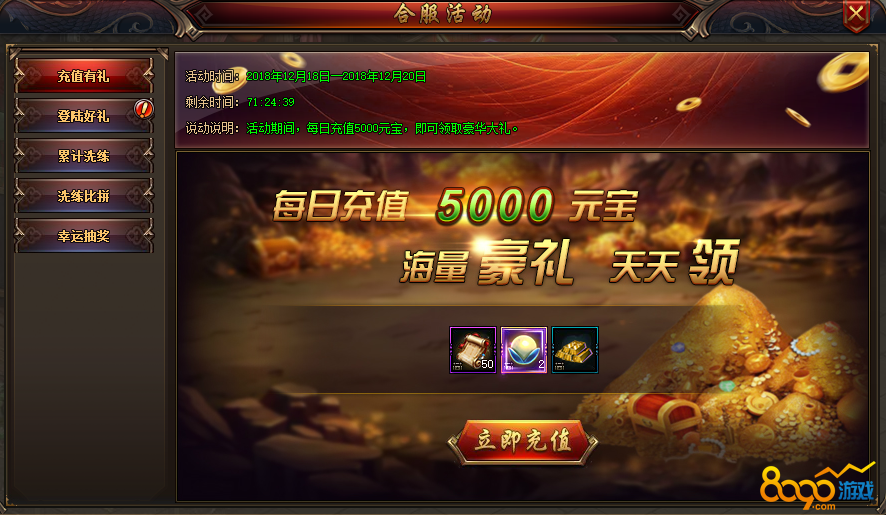 1. 充值有礼:充值要求的元宝,即可领取海量豪礼