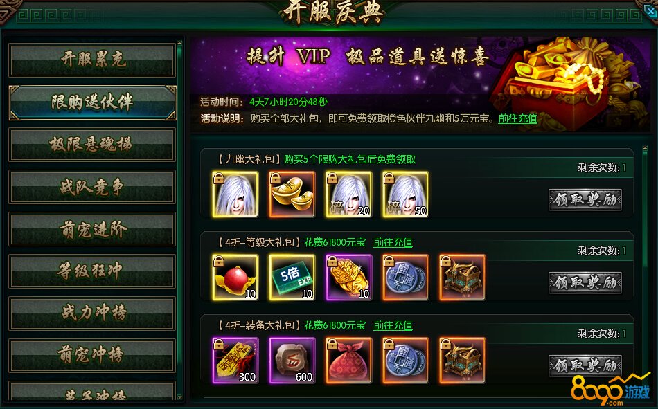 活动期间购买全部大礼包,即可免费领取橙色伙伴九幽和5万元宝