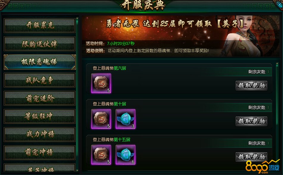 活动期间内登上指定层数的悬魂梯,即可领取丰厚奖励。